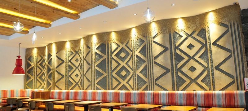Carved clay wall, geometric pattern, Nando’s restaurant in Gloucester